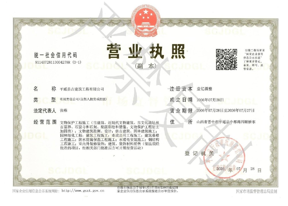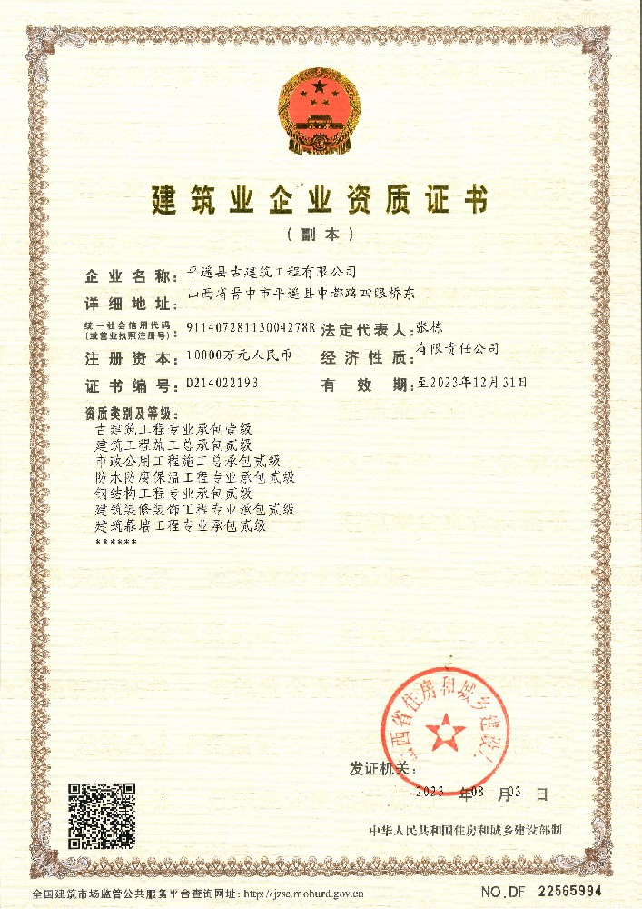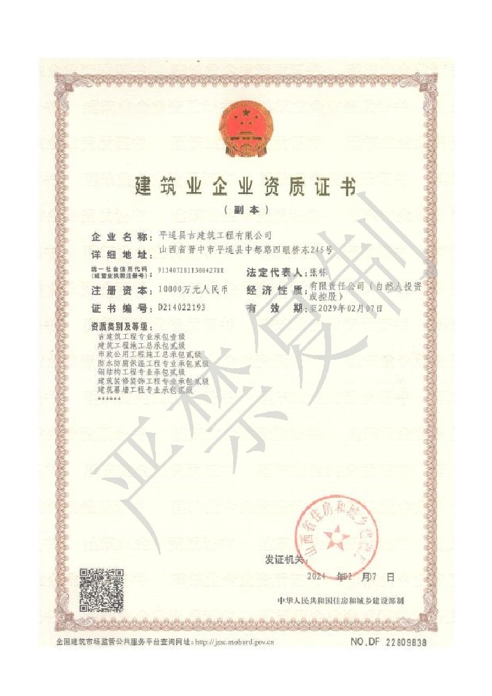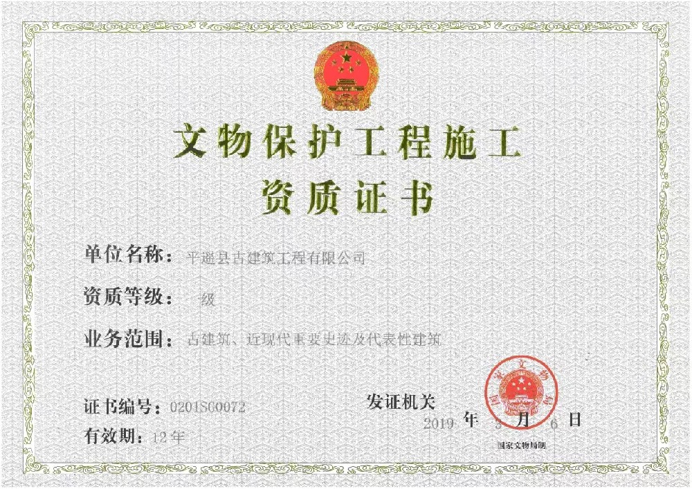 目前公司注冊資本一億元。公司具有文物保護工程施工壹級資質(zhì)、古建筑工程專業(yè)承包壹級資質(zhì)、建筑工程施工總承包貳級資質(zhì)、房地產(chǎn)開發(fā)二級資質(zhì),市政公用工程施工總承包貳級資質(zhì),鋼結(jié)構(gòu)工程專業(yè)承包貳級資質(zhì)、文物保護工程勘察設(shè)計乙級資質(zhì),可承攬古代建筑文物保護修繕、近現(xiàn)代建筑文物保護修繕、仿古建筑、園林建筑、園林綠化、大型展館、室內(nèi)外裝飾裝修、鋼結(jié)構(gòu)、市政、工業(yè)、民用建筑等各種工程的勘測、規(guī)劃、設(shè)計及施工,在木作、磚瓦、雕塑、造像、彩繪、壁畫、布展等傳統(tǒng)技藝方面有著豐富的技術(shù)經(jīng)驗和強大的施工能力,是一個有較強的競爭力和美譽度的現(xiàn)代化企業(yè)。