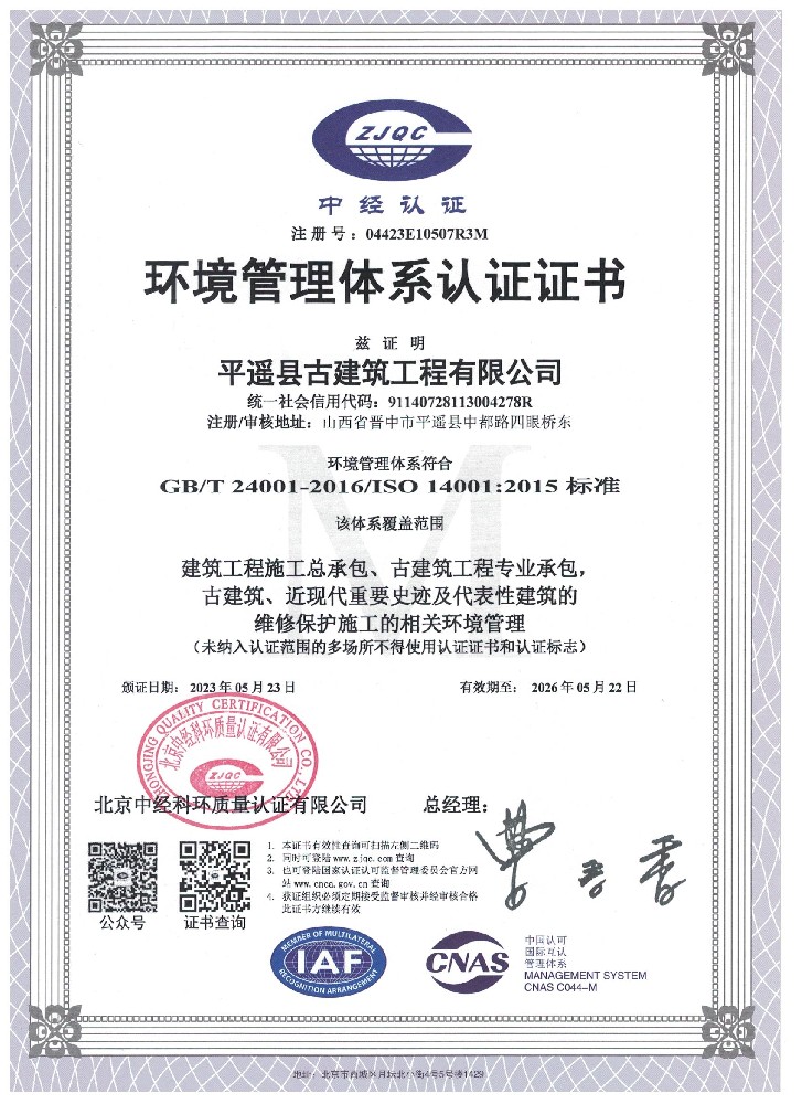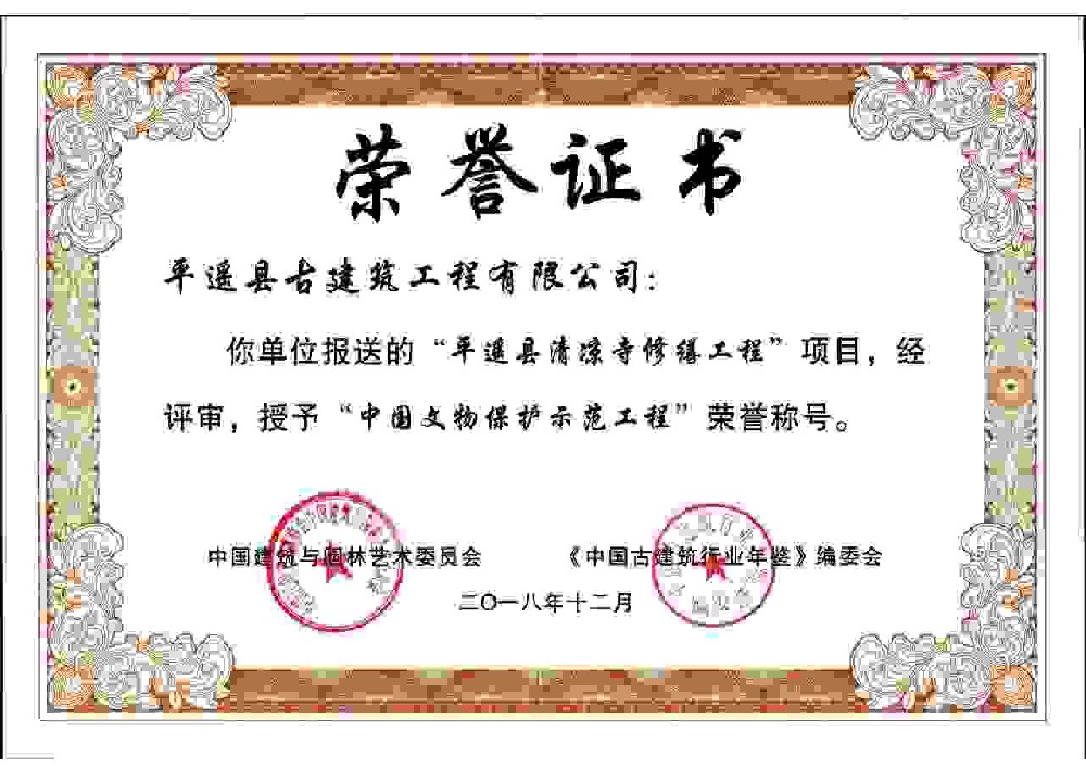 四十多年來,公司堅持以“傳承古建技藝、發(fā)揚民族藝術(shù)”為己任,充分發(fā)揮平遙古城得天獨厚的古建筑文化優(yōu)勢,大力實施品牌發(fā)展戰(zhàn)略,公司以優(yōu)異的施工質(zhì)量、優(yōu)秀的施工進度、優(yōu)良的誠信服務(wù)踐行了社會責(zé)任,取得了驕人業(yè)績,平遙古建公司工程業(yè)績遍布全國二十多個省市,公司先后承建了550余項文物修繕、仿古建筑、工業(yè)民用、園林綠化及規(guī)劃設(shè)計項目,均以鮮明的特色和優(yōu)質(zhì)的施工質(zhì)量贏得了各級政府、文物專家、社會各屆人士的廣泛贊譽。
